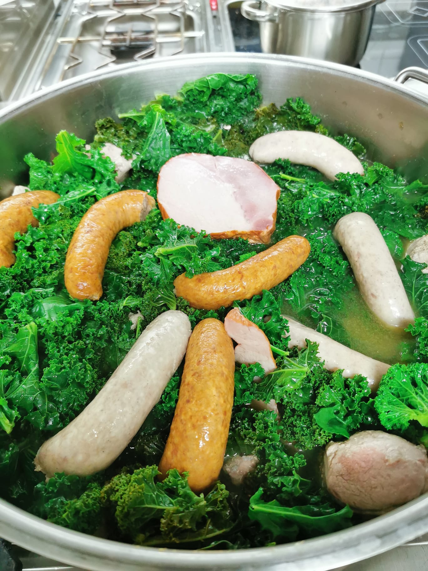 „Grühnkohlbuffet“ inklusive Beilagen, gebrühten und geräucherten Bregenwürsten und Kassler.